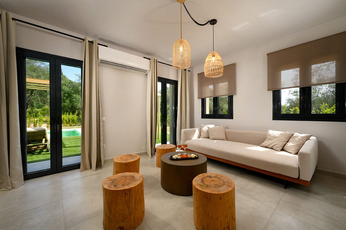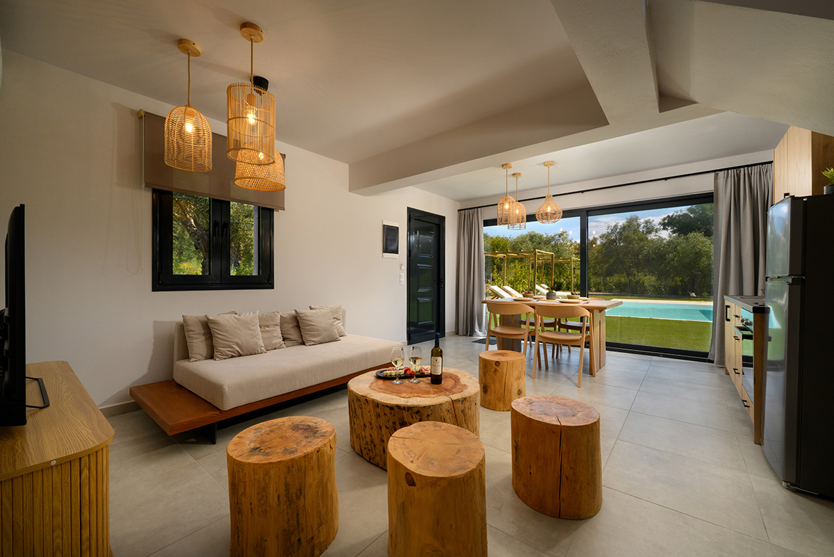 Immerse yourself in the tranquil ambiance of our surroundings as you unwind in the privacy of your own villa. Enjoy modern amenities and stylish decor, ensuring a comfortable stay throughout your vacation. Whether you're lounging by the private pool, savoring a meal on the spacious terrace, or simply admiring the panoramic views of the olive grove, every moment at Olive Trees Villas is a true delight.
